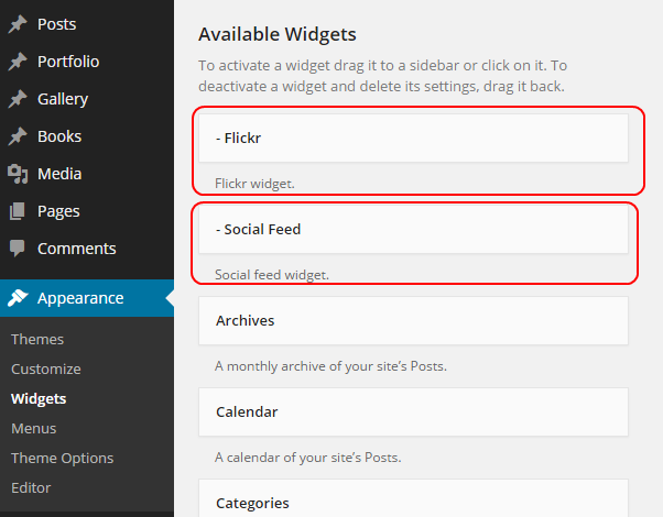 This theme has custom widgets. Drag and drop widgets to widget locations.